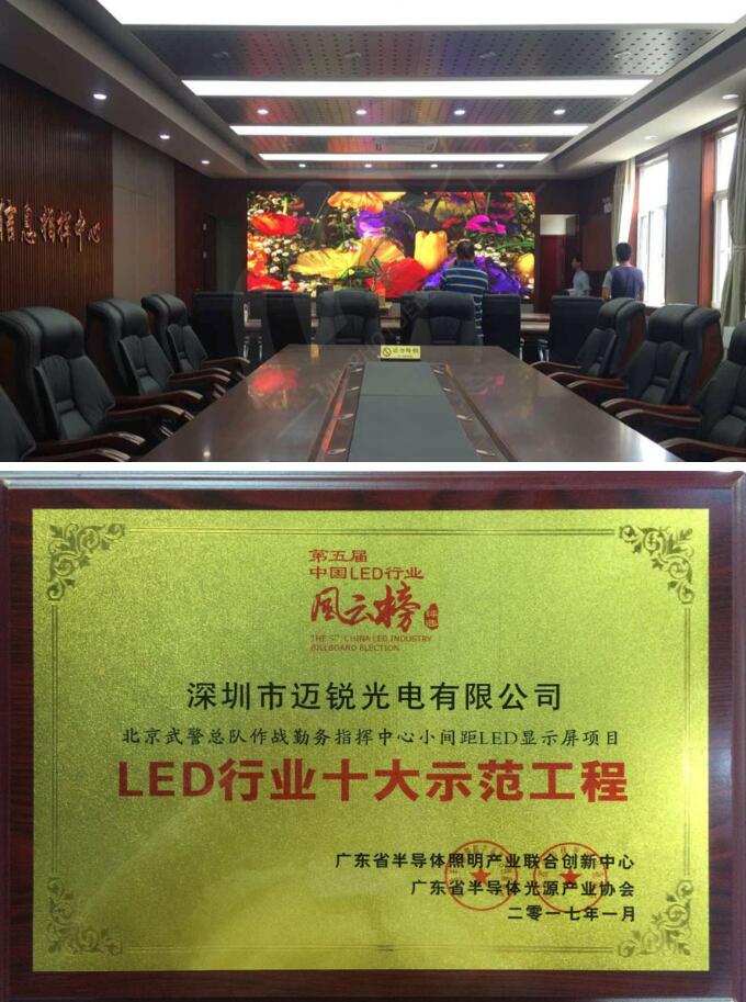 MRLED use project "Beijing Armed Police Corps UTV1.25 small pitch LED display" to won the "LED industry ten demonstration project" .This project uses fine pitch series- UTV1.2 model products, pixel pitch is 1.25mm. This project is one of the national government’s fine pitch project, with a total area of 30 square meters. The project is of great significance to the National Armed Police Corps, but it is also a milestone for MRLED to enter into armed area. The product quality is strict, the function request is rich, the project has adopted a number of leading domestic advanced technologies, including dual backup for signal and powers, wireless connection technology, color gamut correction technology, high gray high refresh, chroma reduction to make it more realistic and full HD, use die-casting aluminum pure 16: 9 ratio of the box, the ratio of the human eye pupil, the proportion of gold to achieve visual enjoyment, and atmospheric fashion display effect. It is MRLED’s front maintenance product, installation and maintenance is more convenient, brightness level can be automatically adjusted. Display multi-project function operate together, so that the entire combat command center can works easy, and get the prise of the Armed Police Corps leaders!